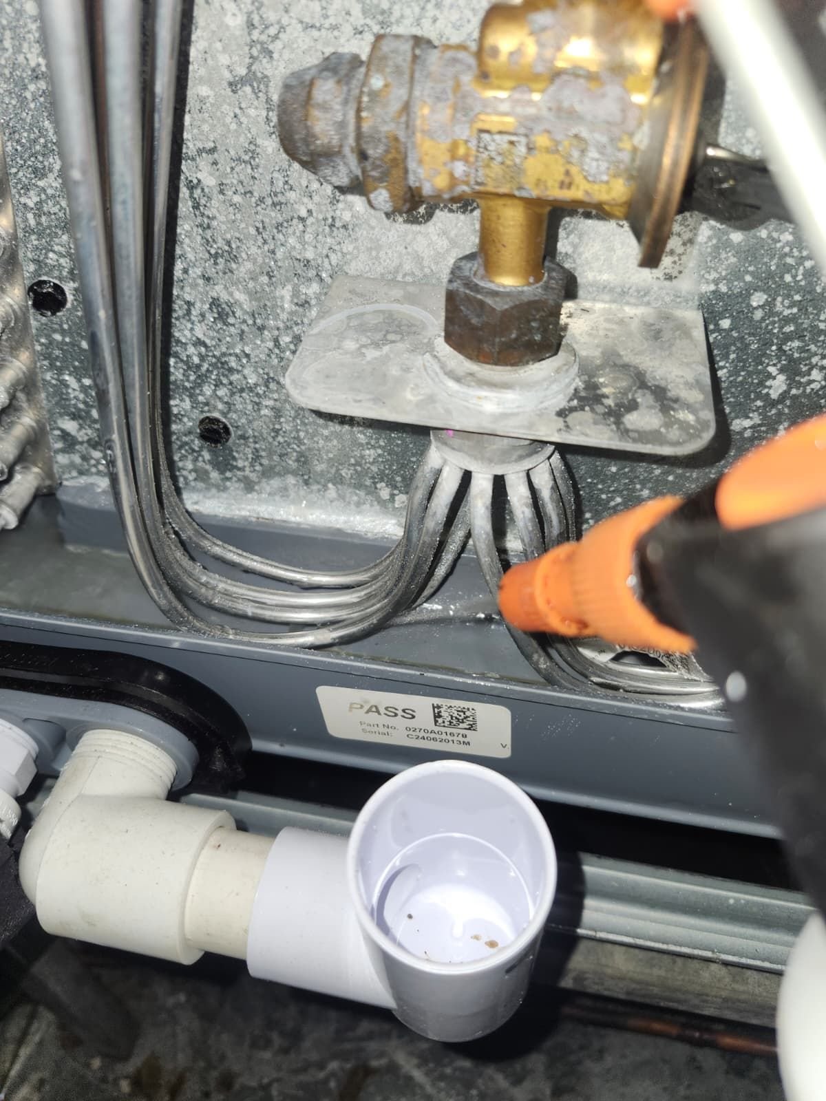 - System is operating with high energy consumption and at risk of water dripping onto the floor from the coil area.