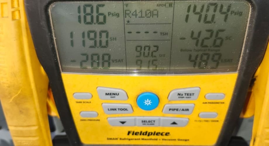 Running a system that’s low on refrigerant can lead to problems like evaporator coil freeze-ups and additional stress on the compressor. In this case, we documented the low refrigerant and signs of a leak and recommended replacement rather than simply adding more refrigerant. That approach is safer for the equipment and more transparent for the customer.