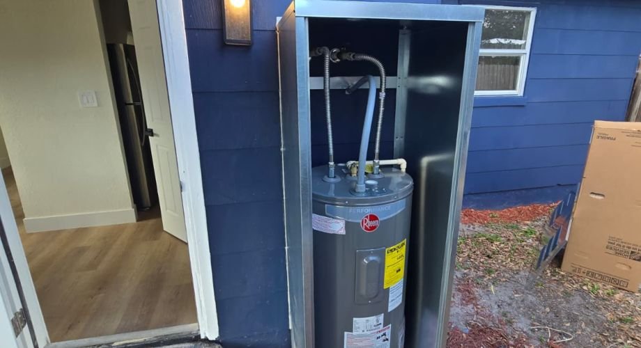 Like many homeowners in St. Petersburg, this customer wanted to control costs by purchasing their own water heater and related materials. They already had the unit, a drain pan, and materials for an outdoor enclosure, but they needed a licensed plumbing company to install everything safely and correctly.